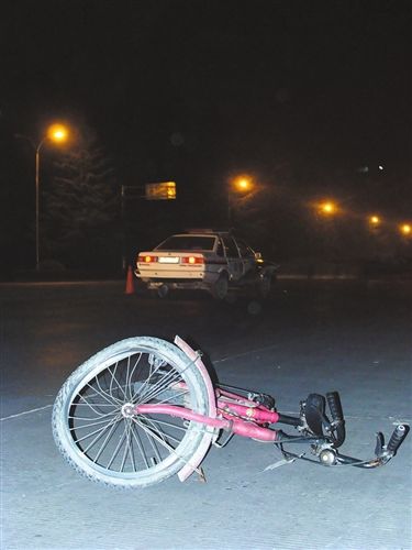 23時45分左右記者趕到事發現場時,幾名交警正在勘查現場。昏黃的路燈下,公路中間躺著遇難者;幾米遠處,是那輛輪胎已經變形的自行車;距自行車10米遠的地方,停著一輛右側前燈處有嚴重“撞傷”痕跡的警用普通桑塔納轎車,警車車牌為“川Z0189警”。