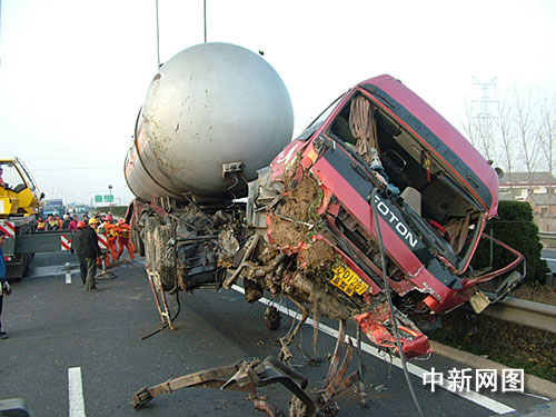 據(jù)了解,液化氣槽車當時共裝載二十三噸液化氣,由山東樂陵開往南京。目擊者稱,當時槽罐車低速行駛,他正常超車時身后忽傳巨大聲響,下車后發(fā)現(xiàn)兩輛車已經(jīng)沖出護欄、向溝中翻滾而去。