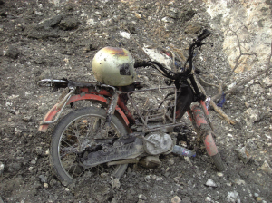 發生爆炸的大坑附近,還有一輛被燒焦的摩托車,車上還有一頂被燒糊的駕駛員頭盔。