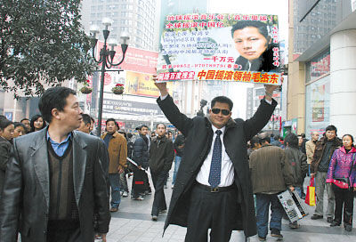 昨天下午4時(shí)許,記者在解放碑步行街看到,該男子舉著一塊長(zhǎng)1米,寬0.5米的廣告牌在游走,衣著及外形模仿周潤(rùn)發(fā)在電影《英雄本色》中扮演的“小馬哥”。牌子上大致內(nèi)容是:“中國(guó)搖滾領(lǐng)袖舉辦搖滾音樂(lè)會(huì),如果你想成名,請(qǐng)收購(gòu)中國(guó)搖滾領(lǐng)袖頭銜,一千萬(wàn)”。他以這身行頭出現(xiàn)引來(lái)上百人圍觀,甚至有市民以為在拍電影,上前與他握手。“他就是上次征千萬(wàn)富婆的那個(gè)人。”部分市民認(rèn)出了這名男子正是幾個(gè)月前曾在解放碑征千萬(wàn)富婆結(jié)婚的“征婚狂人”廣西人毛杰東。毛先生表示,想憑自己酷似發(fā)哥的外形,通過(guò)征婚獲得資金發(fā)展搖滾事業(yè),雖沒(méi)成功,但他熱愛(ài)搖滾的熱情還未減退,這次想在解放碑拍賣(mài)自己“搖滾領(lǐng)袖”的頭銜,也就是拍賣(mài)自己。如果有人愿意拿出1000萬(wàn)或500萬(wàn)來(lái)投資,他就可以組辦搖滾演唱會(huì),并將繼續(xù)曾經(jīng)的征婚路線,到各大城市宣傳自己,下一站將到成都。下午6時(shí)許,經(jīng)保安人員多次勸解、警告,毛杰東才離開(kāi)步行街。