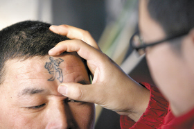 文在哪呢?他想也沒想,指向了腦門。過了30分鐘,一個鏤空的、深藍色的“窮”字就出現他的腦門上了,這個字花了他30元錢。
