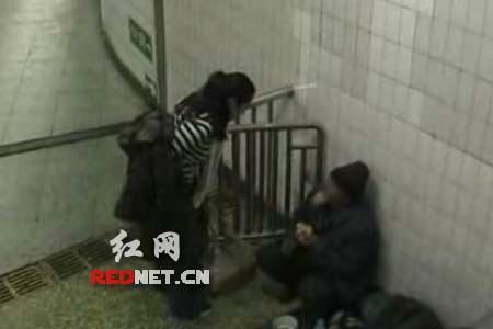 視頻及文字顯示,“12月10日,北京的第一場小雪,明顯感覺到天氣變冷了很多,下午4點半左右,我在北京西單的地下通道看到的感人場面,一位年輕女子走到老乞丐旁邊停留了下來,先是丟了點零錢給乞丐,然后問寒問暖,接著將自己溫暖漂亮的大衣脫下來披到老人的身上,又把自己的圍巾解下來給老人系上,然后消失在人群中,這個過程中不時有路人往老人面前丟錢,在我心中,她或許是中國最美的女人!