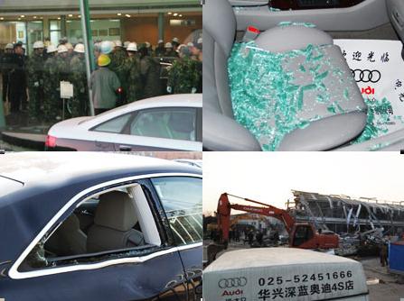 在隨后的7個(gè)多小時(shí)中,這些人砸碎玻璃,用事先準(zhǔn)備好的乙炔槍切斷奧迪店的外鋼支架,又在店中又砸又搶。當(dāng)時(shí)店中有40多名值班的員工,有的被直接打出、趕出店外,有的則嚇得躲進(jìn)展廳內(nèi)的展車(chē)。