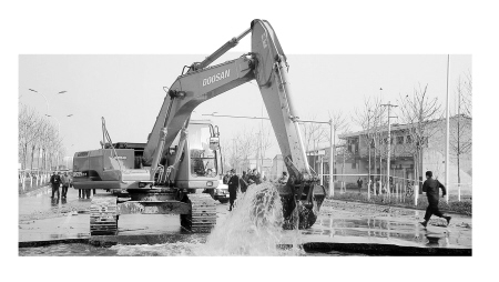 昨天下午14時當記者趕到爆管現場時看到,爆管口還在不斷地向外噴水,爆管處的水泥馬路被強大的水壓徹底掀翻,大水涌向馬路南邊的育才學院和一家汽車專賣店。緊急之下,育才學院發動師生搶險,用沙袋封堵了學校大門口。汽車專賣店來不急關門,半米高的大水柱涌進店門將陳列的5輛汽車下半段浸泡,大水同時還涌進一家公司庫房。據現場目擊者介紹,當時轟隆一聲巨響,現場馬路中間裂開一個大口子,隨之向南育才學院方向傾斜著沖出7米左右高的水柱。由于水量很大,附近下水道不能及時排水,大水綿延到附近村莊。