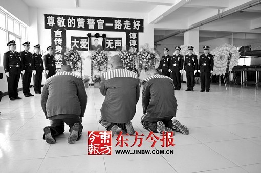 12月17日上午,(河南)省平原監獄食堂破例召開了追悼會。在監獄召開追悼會,這在全國監獄系統還是頭一次。而這個追悼會,是應141名服刑人員強烈要求召開的。12月12日,曾管教他們的51歲獄警黃中文倒在了工作崗位上,他們自愿出錢,請人買了花圈,要求送一送這名好獄警。