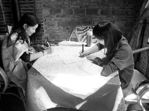 兩名報(bào)名參加富豪相親大會(huì)的女士正在填表。 信息時(shí)報(bào)記者 徐毅兒 攝