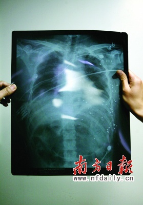 昨日凌晨,周雙明病情告危被轉送到廣州的醫院搶救。周先生告訴記者,照過X光片后,醫生說周雙明心臟、肺、胃、肝和腸中了100多顆小彈丸。截至記者昨晚8時發稿時,周雙明還在重癥監護室中,醫生說要等到晚上才能動手術。
