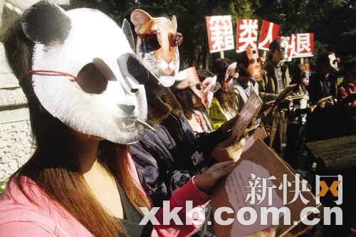 多名自發組織的志愿者頭戴面具,用行為藝術呼吁保護動物。許都/攝