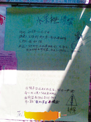 “太強悍了,圣誕節愛情宣言竟然貼到了我們女生宿舍的宣傳欄上!”江南大學一名女大學生向記者報料稱,該校北區女生宿舍樓下的宣傳欄里出現了一張張名為“水果攤情緣”的“很強大”的求愛海報。