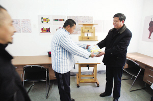 捐贈儀式上,張金寶代表同伴們從蔣卓平手中接過了畫筆等繪畫材料,兩年來他想繼續畫畫的心愿終于實現了。對最具天才的張金寶來說,他并不著急動筆,他摸摸自己腦袋告訴記者說:“好長時間不畫了,腦子有點空,畫什么我要再想想……”
