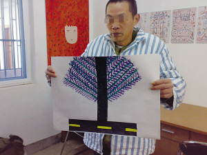 昨天下午兩點鐘的光景,在所有當時參加郭海平實驗項目中繪畫水平最令人驚嘆的張金寶和另兩位也畫得很出色的同伴王軍、張兵一起,在祖堂山精神病院八病區懶懶地曬著太陽。“又可以畫畫了,我就不出去找老婆了”,張金寶入院后,同樣有精神病癥狀的愛人離家走失了,他老念想著要出院去找她。