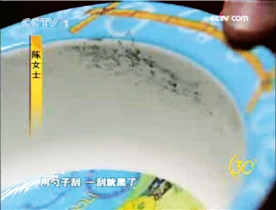 據董金獅介紹,調研小組利用日常生活中常用的電磁爐、帶蓋的不銹鋼鍋等器具和日常飲用的純凈水模擬實驗條件,對樣品進行了耐濕熱性測試。“首先將樣品放在沸水中(保持沸水狀態)煮30分鐘后撈出,在室溫中放置30分鐘后再放入沸水中(保持沸水狀態)煮,此過程重復4次。在煮的過程中,發現部分樣品有裂紋、變形和發白現象,且釋放刺鼻、熏眼睛的氣味,”董金獅稱,“以家樂福銷售的由臺州市希爾家庭用品有限公司生產的綠色密胺碗為例,國家環保產品質量監督檢驗中心檢測為合格,但在此次模擬測試中卻發現,樣品在第一次放在沸水中時就有明顯的發白現象,且時間越長,發白面積越大,同時釋放出刺鼻、嗆眼的氣味。從批發市場抽檢由北京佳美密胺制品有限公司生產的內紅外黑密胺碗也是如此。”