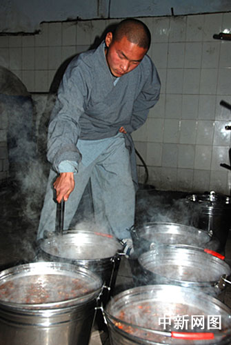 中新網鄭州12月31日電(記者 朱曉娟)為確保臘八節施粥順利進行,12月30日中午少林藥局的師父們便在少林伙房試煮五行八寶粥。