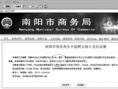 這不,南陽市商務局網站就有消息稱:商務局招聘兩名文秘,要求年齡不能超過330歲。