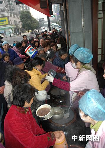 “與以往相比,今年的人流尤其大,從早上6點(diǎn)鐘開始,隊(duì)伍就再也沒有縮短過,反而是有更多的人加入到等候施粥的行列中來,估計(jì)到8點(diǎn)多人流高峰時(shí),河坊街會(huì)相當(dāng)擁擠。”方回春堂的負(fù)責(zé)人介紹說,他們昨天徹夜趕工,準(zhǔn)備好的臘八粥應(yīng)該不會(huì)讓市民空手而歸。