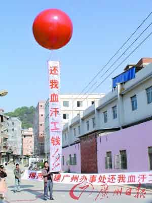 昨日上午,在廣從公路黃莊一帶,一中年男子買來一個紅色大氫氣球,升起條幅,意欲向包工頭追討3萬余元報酬。