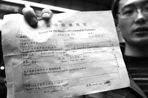 “我覺得銀行應該有責任!眲⑾壬f,這是第一次從自動取款機上取到假鈔。昨日,銀行經理告訴他,以銀行的技術不可能出現這種問題,并將劉先生的假鈔收繳了。 (記者 葉婧)