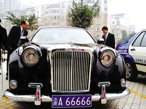 昨日,記者在論壇上看到,天涯網友“還說啥”貼出了兩張同樣懸掛著“渝A66666”藍底色車牌的豪華車,其中一輛為一臺限量版的日本光岡老爺車,據估計價格約為一千萬元人民幣。網友還指出,老爺車好像是重慶一開發商的。