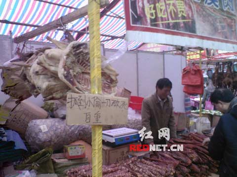 10日上午,網(wǎng)友“湘水悠悠”在紅網(wǎng)論壇發(fā)帖,稱在網(wǎng)上看到一個(gè)頗有調(diào)侃味的照片帖,標(biāo)題為《常德驚現(xiàn)最血腥警示牌》,帖子附帶一個(gè)疑似農(nóng)貿(mào)市場(chǎng)上商鋪的照片,在貨臺(tái)旁的柱子上掛著一個(gè)雷人警示牌“抓到小偷一刀砍死,自重”,還有紅網(wǎng)常德網(wǎng)友爆料稱在“年貨展銷會(huì)上親眼看見過”。
