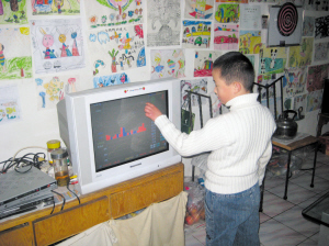 記者日前一進小信信家,就被客廳四周貼滿了的畫吸引住了:有飄著鮮艷的五星紅旗的遠洋艦;有活潑可愛的兩只大熊貓;有遨游在大海的快樂魚兒。一臺電視機正在播放股市行情的節目,小信信則聚精會神地觀看著,并很專業地向記者講解與分析(見圖)。