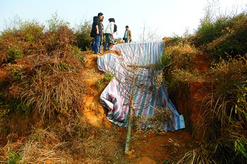 當地一些村民也知道這起發生于2008年底的盜墓案件。不過,古墓究竟是什么樣子?墓中出土了什么器物?村民們都不甚了解。一位村民說:“當時公安局和文物局的人都來了,他們在墓邊上挖了很多土溝,還發現了一塊絲綢呢。”另一位村民描繪說,絲綢底色呈綠色,上面繡有一只鳳凰,“鳳凰好像是黃色的。”