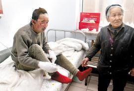昨日,記者來到長春燒傷醫(yī)院,見到了母子兩人。42歲的崔某頭部、面部、雙手等處被燒傷,雙手纏著厚厚的紗布。崔某83歲的母親一直在病房內(nèi)照顧兒子。