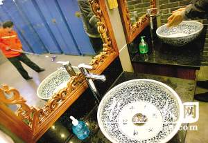 廁所里面布局大體和普通廁所一致,不同的是,洗手池是高檔的青花瓷,而且還多出了專供殘疾人士和母嬰專用的兩個(gè)隔間。隔間的門是紅色木雕門(男廁為藍(lán)色),且是明清風(fēng)格的兩扇拉門,其上雕刻細(xì)致,圖案精美,連拉環(huán)的做工都很逼真,記者感覺,進(jìn)去如廁就好像進(jìn)了一個(gè)古時(shí)候的廂房。