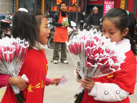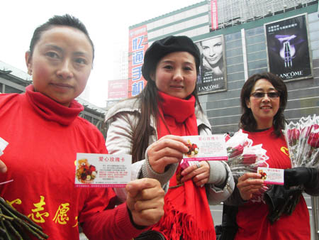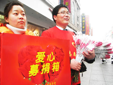 “買支玫瑰獻愛心吧,為災(zāi)區(qū)的孩子添本書。”2月14日,情人節(jié),數(shù)百名大河網(wǎng)友聚集二七廣場義賣玫瑰,所得善款將用于為災(zāi)區(qū)孩子購置愛心圖書。