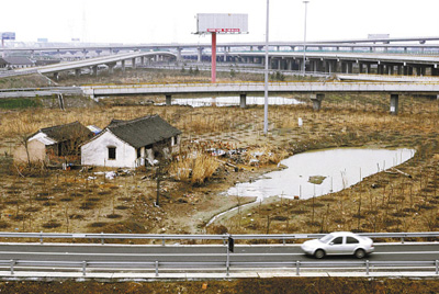跨過一張已經被撕裂的鐵絲網,快速奔過兩條雙向六車道的高速公路和往上海方向的匝道,那呼嘯而過的車輛讓我不寒而栗。強壓住內心的恐懼,繼續翻越往杭州方向的匝道,往前三百米,又穿越高架匝道,邁過雜草叢生、凹凸不平的地面,再往里前行二百米后,隱約看見一戶被條條匝道環繞著的小屋。據村民介紹,這條“長征路”是唯一能到達王來英家的“通途”。