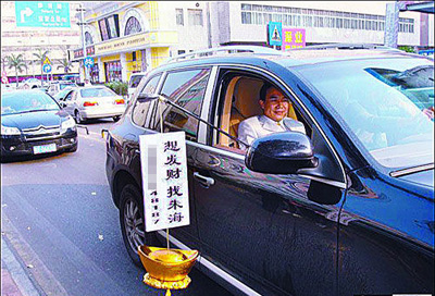 組圖中,一輛黑色保時捷正在行駛,前排一白衣中年男子將一雷人“釣具”伸出車窗外,邊行邊“釣”。“釣竿”是一個高爾夫球桿,“魚餌”是個“金元寶”,“垂釣”口號則是“想發(fā)財找朱海”,字旁標有一個手機號碼。據(jù)圖說介紹,該場景出現(xiàn)在2月20日的深圳市羅湖區(qū)寶安北路深圳市人才市場附近。