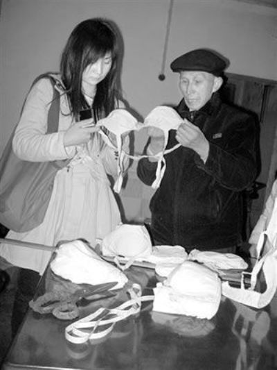 傍晚,大爺在桌子上堆起一大摞成品胸罩,都是樣品。大爺說:“從4寸到8寸的都有,你看這做工!”“我只懂A杯、B杯啊!”說完這話的劉梅,看到大爺一臉茫然。傳統(tǒng)的尺寸和現(xiàn)代的“杯標(biāo)準(zhǔn)”成為老少兩代人的第一道難題!熬褪菑淖钚〉阶畲舐,簡單,下來慢慢換算。”3人和冉大爺?shù)溺蹆合敝艽蠼阋黄鸺?xì)化即將開始的工作。周大姐當(dāng)“打工”,兩個(gè)同學(xué)負(fù)責(zé)把信息上傳貼吧并建起一個(gè)網(wǎng)店。“25-80元一個(gè),純棉面料環(huán)保,手工制作個(gè)性,對于一大一小或單邊的客戶更是長項(xiàng)。”這是他們初步的網(wǎng)絡(luò)宣傳詞。