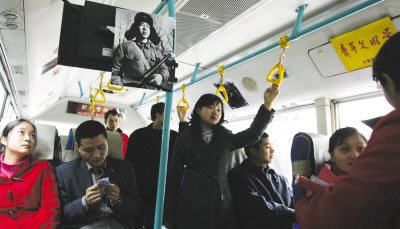 記者在車上觀察發(fā)現(xiàn),幾乎每個乘客走進(jìn)601車車廂時,都會將目光停留在雷鋒照片上,有人還會喃喃自語:“又到學(xué)雷鋒日了呀”。似乎并不是每個乘客都認(rèn)識或了解雷鋒。10點(diǎn)過,3個初中生模樣的男孩走上車,看見雷鋒照片后忍不住發(fā)問:“這是誰呀?”當(dāng)售票員讓他們猜猜時,一名叫杜宇的男孩竟稱“他穿了軍裝拿著槍,是不是董存瑞?”這幾名自稱是長壽區(qū)的孩子表示,他們都是初二的學(xué)生,此次隨父母從廣東轉(zhuǎn)學(xué)回老家。他們表示,自己并不知道學(xué)雷鋒行動日,也不清楚雷鋒的故事。