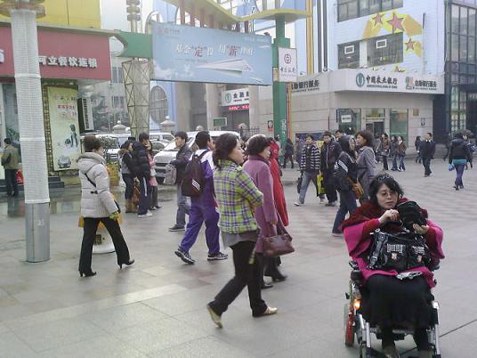 “救救這個22歲的新娘子吧,謝謝你的愛心。”殘疾人劉冰心坐著電動輪椅在青島市區為白血病新娘高俊峰奔走呼告,籌集“善款”。