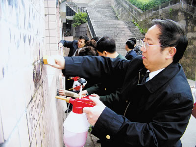 手拿刷子、噴水槍和抹布,公務纏身的書記、縣長親自動手清除城市“牛皮癬”。3月13日,一網友在大渝網三峽吧發出的帖子《云陽書記縣長走上街頭清除“牛皮癬”何需親歷親為?》,引發網友熱議。有網友不解,書記和縣長何必在百忙之中對此“小事”親歷親為。從山東到云陽交流任職的云陽縣委書記李洪義昨日介紹說,云陽縣正在創建國家衛生縣城,他希望通過自己的行為,號召大家一起關心城市環境。