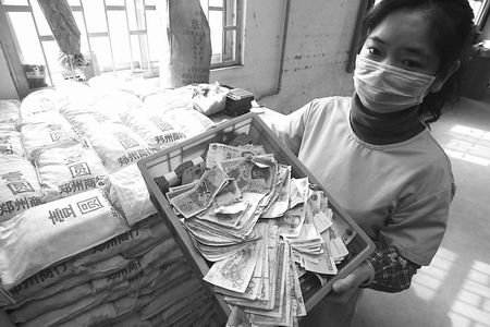 “這些全是假幣!”昨天,在鄭州市公交總公司點鈔大廳,一個個白色布袋堆放在墻角,每個布袋上都標有“壹圓”字樣。一位趙姓工作人員說,每個布袋里都裝有2000個一元假硬幣,重10余公斤,一共288袋。記者注意到,在堆放的假硬幣上面,擺放的塑料筐里裝著面額不等的“鈔票”,“它們也都是假幣”。