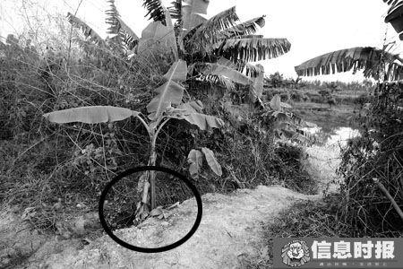 空地另一面是當(dāng)初掩埋尸體的地方,水溝邊長滿雜草,附近種上了一些蔬菜和香蕉樹,有兩三個農(nóng)民正在為莊稼除草。