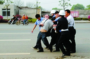據(jù)陳勇介紹,昨日下午4時,他正在中南大學(xué)新址的拆遷現(xiàn)場采訪。當(dāng)時,有拆遷戶拉著橫幅,與數(shù)十名身著城管和聯(lián)防制服的男子對峙。“剛開始還算平靜”,不多時,五六名穿制服者圍毆一名拆遷戶。