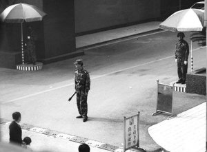 21日晚,“3·19”搶槍案件發(fā)生地某駐渝部隊門崗,原本只有兩名哨兵站崗值勤的部隊大門前,值勤人數(shù)已經(jīng)增加到了5人。門崗前的馬路上,依舊人來人往,幾個擺賣燒烤和水果的攤檔前,不時有顧客光臨。
