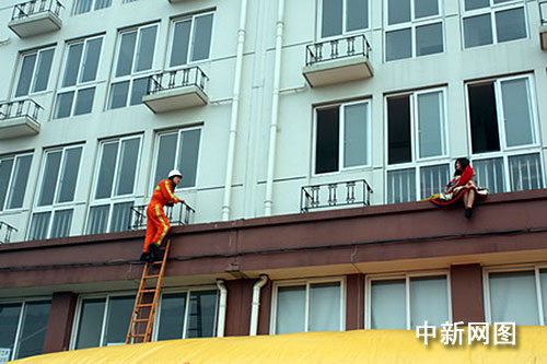 接警后的消防官兵迅速到場,指揮員立即下令對事故現場進行警戒隔離,維持現場秩序,防止圍觀人員起哄,影響救援工作;同時在輕生者所站位置下方迅速鋪設救生氣墊,防止意外情況發生;同時由指揮員帶領1名官兵到二層窗外露臺上進行營救。