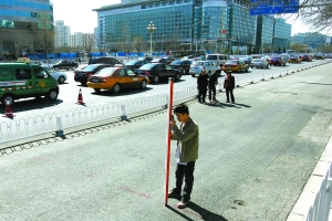 昨日12時許,西單文化廣場前的長安街非機動車道兩頭出入口,已經被拉上警戒線,交警及協管員指揮過往非機動車,由廣場人行道繞行。警戒線內,非機動車道上一面積近40平方米的路面輕微凹陷,形成一個明顯但弧度不大的低洼處。柏油路面上,工作人員用噴漆標記了沉降范圍,以及需要進行勘測的監測點。
