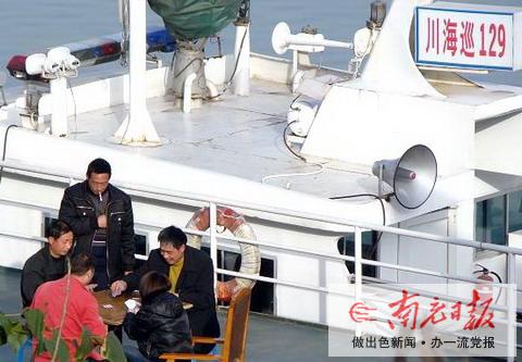 3月25日,記者在四川新聞網麻辣社區里看到,有關南充市地方海事局工作人員上班時間在海事船上打牌的圖片格外引人注目。網友稱其為“嘉陵江上最‘牛’游船”。記者在網上看到,一艘標有“中國海事”字樣的船,停泊嘉陵江三橋附近,緊挨此船停泊的是一艘“川海巡129”執法船。