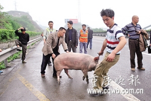2008年2月26日,渝黔高速路金竹崗隧道,5肥豬“跳車”攔路,一輛奧迪將2頭豬撞死,隧道交通中斷1小時(shí)。