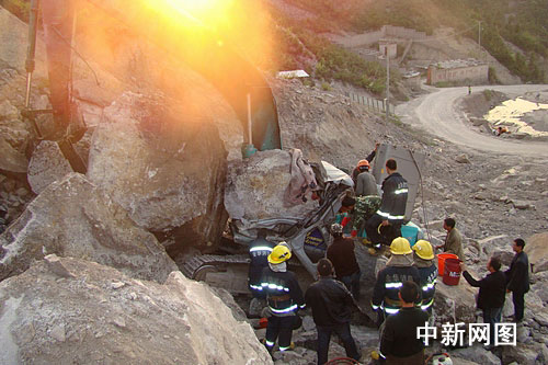 發生滑坡事故地點位于上屋采石場的半山腰,消防隊員攜帶破拆工具徒步上山。在現場,挖掘機被兩塊巨大的石頭壓得面目全非,駕駛室已被壓得完全變形。一名40多歲的司機被牢牢壓在駕駛室內,為防止再次滑落,幾名工人用鋼釬將巨石牢牢頂住。