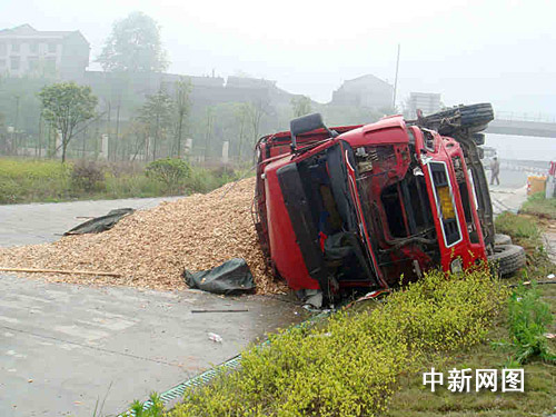 中新網長沙4月17日電(雷坤平 肖前輝)17日上午,一輛超載的大貨車在駛入邵(陽)懷(化)高速公路安江服務區時,因駕駛員疲勞駕駛操作失誤,導致大貨車側翻在服務區入口處。