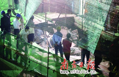 昨晚9時,在事發現場,一臺高十幾米的灌漿機像一頭龐大的大象,鼻子一拱一拱地在灌泥漿。4臺攪拌機正在轟鳴著給它“補給”。借助工地上高倍的燈光照射,施工現場忙碌而緊張,幾十名工人正在加入到這場“急救”中。
