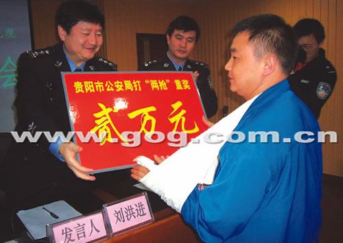 4月28日,貴陽(yáng)市公安局召開(kāi)“打擊‘兩搶一盜’犯罪、偵破命案”有獎(jiǎng)舉報(bào)獎(jiǎng)勵(lì)兌現(xiàn)新聞發(fā)布會(huì),包括協(xié)助特警擒獲嫌疑人的的哥鄭宏等37名見(jiàn)義勇為的市民受到獎(jiǎng)勵(lì),警方為這37名市民兌現(xiàn)獎(jiǎng)金共計(jì)157000元。