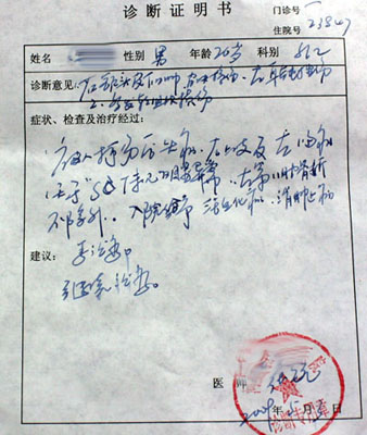 在醫院出具的張先生的診斷證明上,有這樣的記錄:“左額頭皮下血腫,左耳頓挫傷,多發軟組織損傷,左第11肋骨折不除外”。