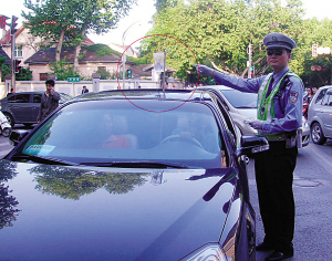 前天傍晚6點多,南京交警五大隊民警喻何鑫正在北京西路西康路路口值勤,這時電臺突然響了,在云南路執勤的同事告訴他,剛剛有一輛黑色轎車駛過,從天窗中伸出一根桿子,上面還掛著一個塑料袋。同事讓他攔下檢查一下,于是小喻就在路口等待。很快,一輛黑色轎車駛來,小喻定睛一看,就是同事說的那輛車。再仔細辨認,小喻嚇了一跳,原來這伸出天窗的居然是一根掛水桿,上面還有輸液袋。難道是車主一邊掛水一邊開車,小喻趕緊上前將該車攔下,靠邊停車后,他才發現是坐在副駕上的女子在掛水!熬尤荒苓@樣掛水,真是神奇”,“看來天窗也有好處啊,桿子伸出來方便!甭愤^市民看到這一“奇景”后紛紛駐足議論。