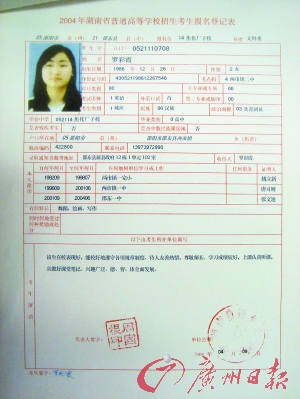 記者昨日查閱假羅彩霞當年被錄取的紙質檔案。這份編號為“520821102”的《湖南省2004年普通高等學校錄取新生名冊》上,“羅彩霞”的考生號為“04430521110708”,批次為“第二批”,錄取形式為:“計劃:國家任務定向”,上面還有羅彩霞的身份證號等考生基本信息。這份新生名冊的左下方加蓋了“湖南省普通高校招生委員會錄取專用章”的大紅印章。黃開烈說:“我們不能隨便懷疑這個考生是假的。我們每年招6000多名學生,每個都去懷疑是不可能的。造成假羅彩霞事件的本質問題和根源問題不在貴州師大。他們造假能做到這一步,也是我們無法想象的。”(文/圖 特派貴陽記者文遠竹)