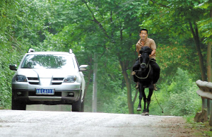 在天坪村公路上,記者找來一輛三菱車,想與“大黑”比試跑1公里。“大黑”卻犯倔了,怎么也不讓主人上馬。張興福便貼在它耳邊悄悄地說“你是好兄弟”、“你跑好了,給你草料吃”等好話,它才不情不愿地聽了話。